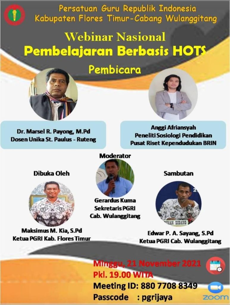 PGRI Cabang Wulanggitang akan mengadakan webinar pada Hari Minggu (21/11/21) dengan tema “Pembelajaran Berbasis HOTS” dalam menyongsong HGN 2021 dan HUT ke-76 PGRl. Acara ini akan melibatkan guru- guru di Kabupaten Flores Timur.